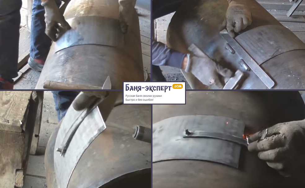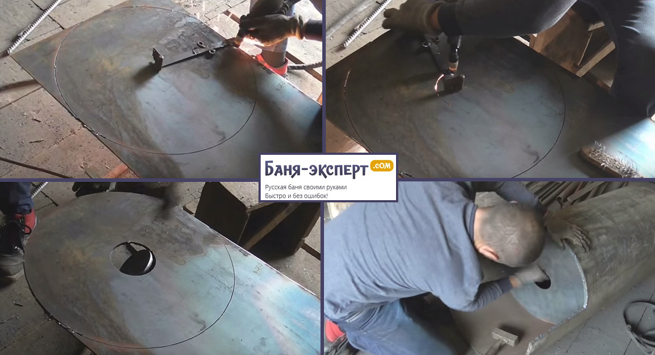 Важно, чтобы дно этого бака было выполнено в точности так же, как верхняя часть каменки. С помощью сварочного аппарата к его дну крепится труба – она пройдет сквозь центр всего бака и выступит сверху примерно на 350-400 мм. Также необходимо обустроить на баке крышку, выполненную в виде полуокружности