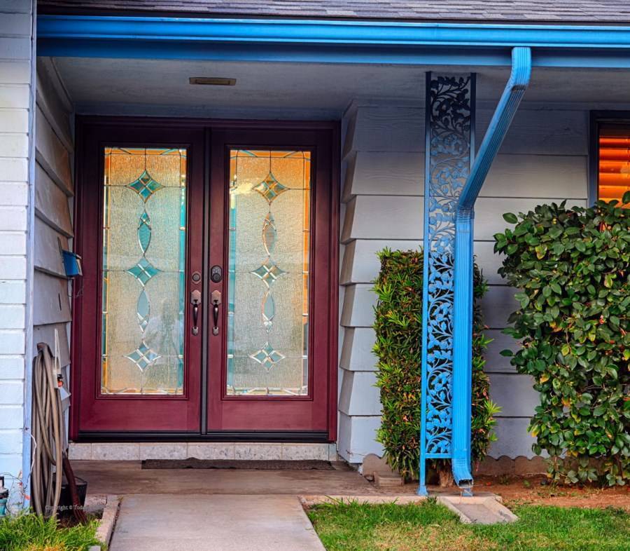 Устанавливая входное дверное полотно в частном доме, весьма элегантно будет выглядеть оформление конструкции стеклянными вставками. При этом стекло может иметь абсолютно любые формы: от строгих и лаконичных прозрачных квадратов до замысловатых витражей. Довольно эффектно выглядят входные двери с коваными элементами поверх стекол.