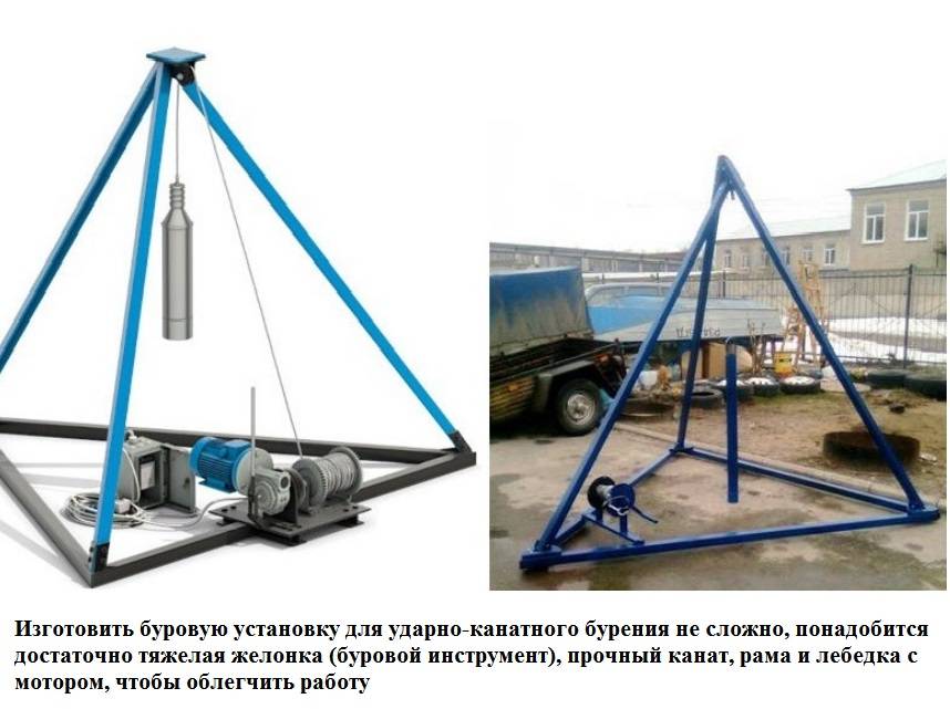 Следующим действием над углублением устанавливают металлическую треногу, которую часто называют вышкой. Она должна располагаться в прямом положении. В месте соединения треноги закрепляют лебёдку. На треноге располагается бурильная колонка полутораметровыми штангами.
