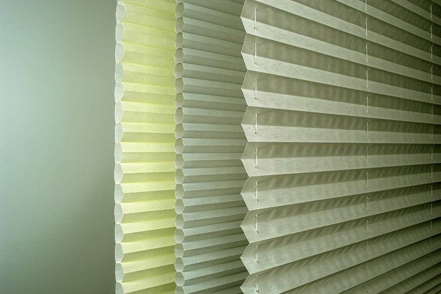 - Плиссе. В них сочетаются преимущества горизонтальных жалюзи и плиссированной ткани. Особенностью является возможность использования для благоустройства оконных проемов любой формы и любого угла наклона.
