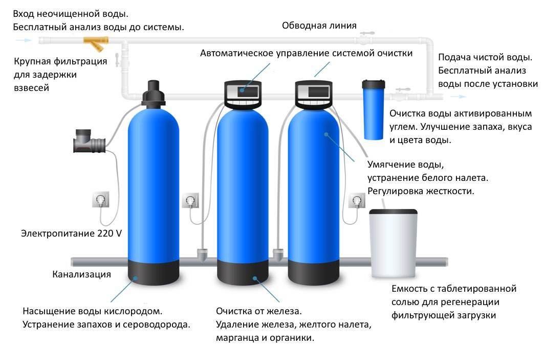 Каждый метод очищения имеет свои особенности. В частном доме рекомендуется устанавливать станции комплексной очистки, подключенные в месте входа водопровода в дом. Они сначала отфильтровывают крупные частицы примесей, затем проводят обезжелезивание и смягчение воды.