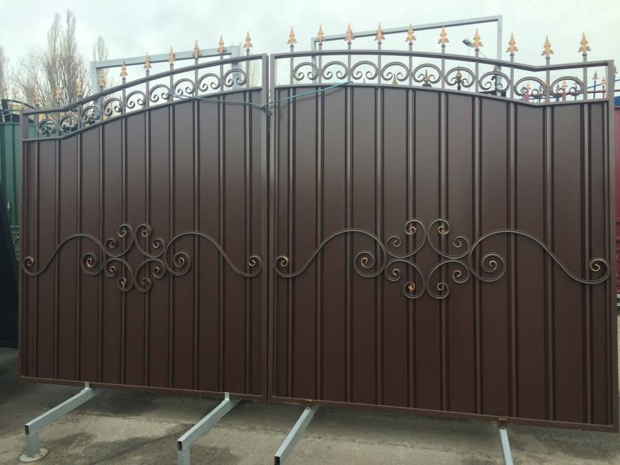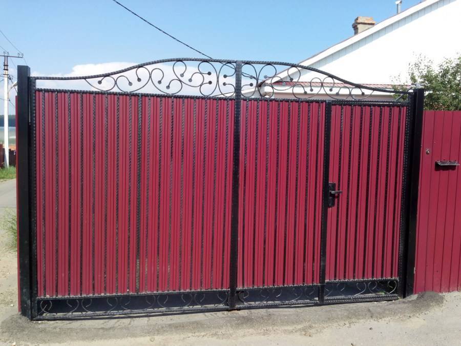 Это более простые ворота из профнастила с калиткой, состоящие из 1 или 2 поворотных полотен, каждое из которых установлено на отдельном опорном столбе. Калитка для прохода людей может быть смонтирована отдельно или располагаться на поверхности одной из створок.