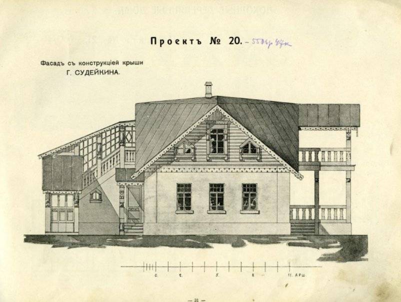 В 1914 году знаменитый русский архитектор Григорий Михайлович Судейкин выпустил собственную книгу, которая называется «Альбом проектов зимних дач, изб, особняков». Это издание стало настоящим учебником, да и просто настольной книгой для многих поколений проектировщиков, архитекторов и дизайнеров. В ней можно было почерпнуть множество интересных идей и конструктивных решений, но более всего внимания привлекла оригинальная конструкция крыши.