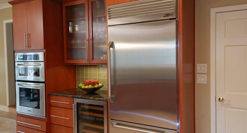 - Техника, расположенная в стенных нишах или в шкафах, будет отличаться более тихой работой, практически бесшумной. Такое соседство с мебелью и стенами способствует поглощению звуков, в то время как работу обыкновенного холодильника бывает слышно даже из другой комнаты.