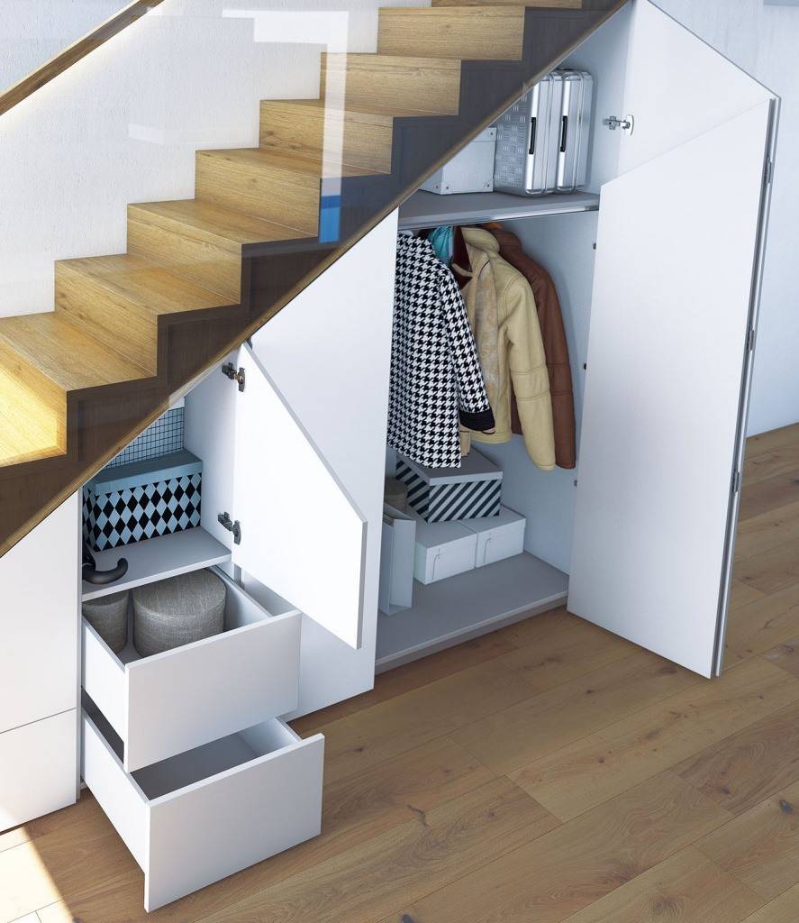 Частные дома часто оборудуются лестницей в прихожей. Она занимает и без того небольшое пространство, поэтому поставить в помещении полноценный шкаф не получится. А вот устроить его под лестницей вполне возможно.