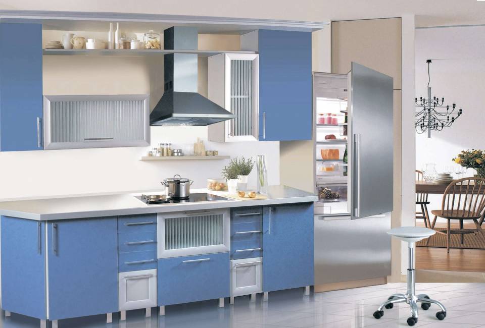 Смелое сочетание дымчатого и голубого создаст нужную атмосферу, в которой будет приятно готовить пищу и долго проводить время всей семьей. Одним из основных вариантов оформления стен является плитка. Если выложить фартук понравившемся вам синим тоном плитки, она будет волшебным образом оттенять серебристую кухню.