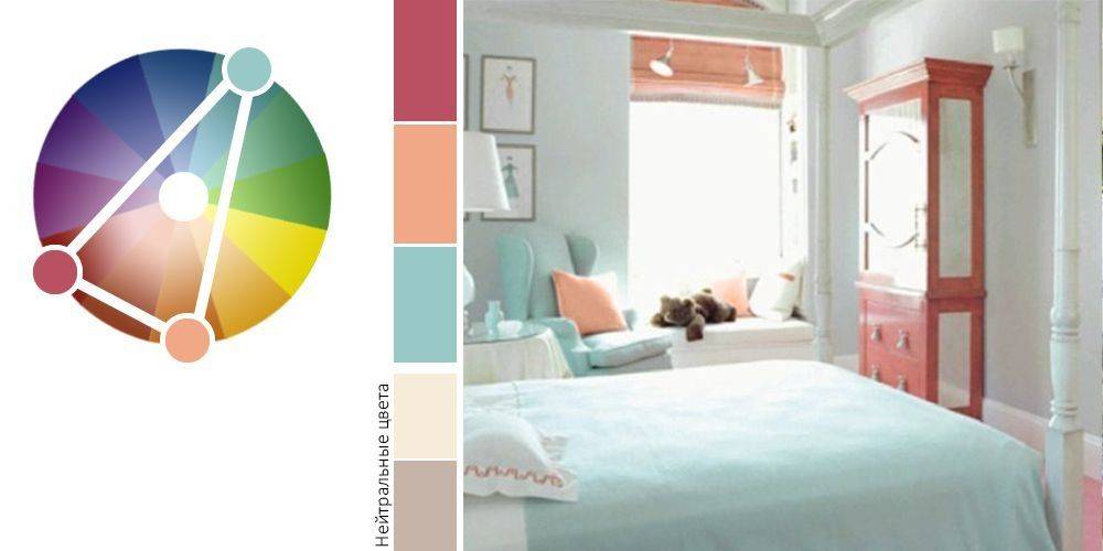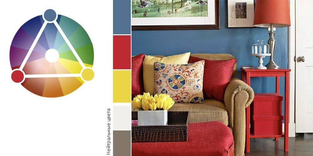 Это уже более сложный вариант. Сочетание трех цветов, равноудаленных на круге. Здесь за основу обычно берется один цвет. Два других используются для расстановки акцентов. Если боитесь, что выйдет слишком пестро — разбавьте нейтральными цветами «по вкусу».