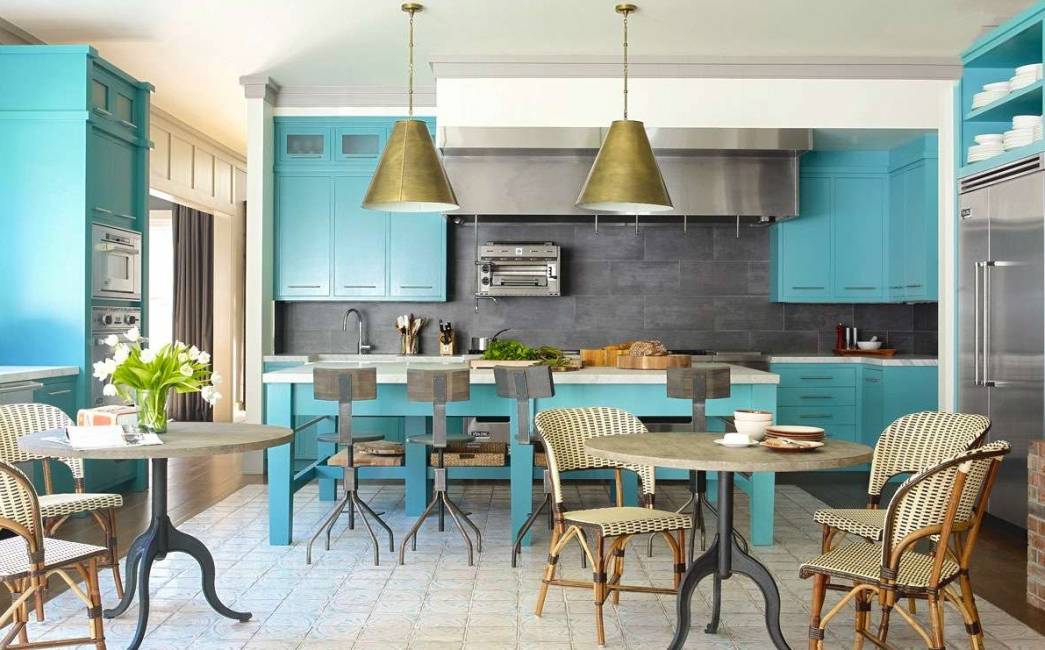 На фото тёмно-бирюзовые фасады со стеклянными вставками, которые делают шкафы визуально легче.