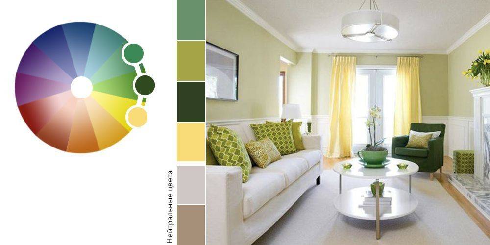 Это самый простой и «безопасный» вариант. Берется 3 идущих подряд цвета из палитры. Используйте в оформлении интерьера оттенки этих цветов и спокойный, красивый интерьер вам гарантирован.