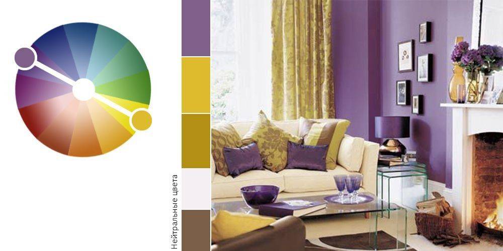 Это похоже на комплиментарное сочетание, только к одному из цветов добавляются два соседних сектора. Оформите квартиру в этих тонах, а контрастный оставьте для небольших интересных деталей. Или, наоборот, — сделайте основным один цвет, а два других, более близких, используйте для акцентов.