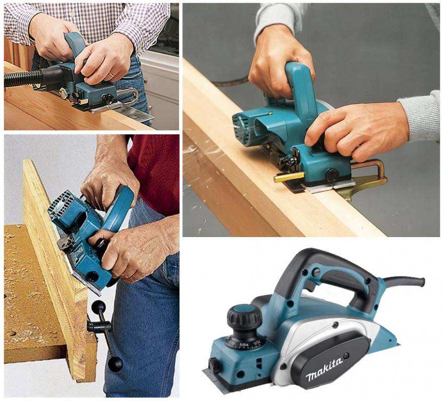 Первое место занимает небольшой и отлично сбалансированный электрорубанок Makita KP0800. Относится к бытовому классу. Мощный электромотор раскручивает ножевой блок до 17000 оборотов. Благодаря этому рубанок может быть использован не только для чистового строгания и выборки четверти, но и для фальцевания древесины.