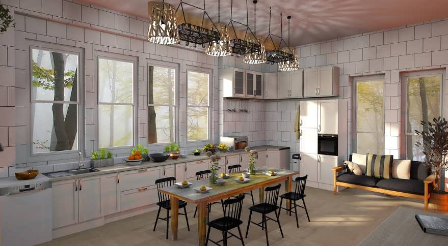 Применение обоев под имитацию кирпичной кладки на кухне является чуть ли не классикой. Просторные помещения роскошно смотрятся со стенами с черным кирпичом. Зону отдыха можно визуально разграничить наличием дивана и журнального столика. Хорошо смотрится кирпичная кладка рядом со сплошной заливкой цветом на стенах и контрастной мебелью. Освещения добавит подвесной потолок и отражающиеся на нем блики от лампочек.