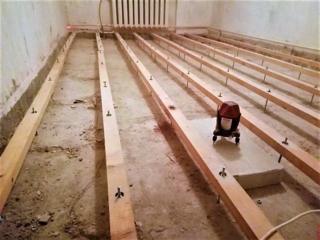 - по требуемому уровню на пол укладывают деревянные рейки;