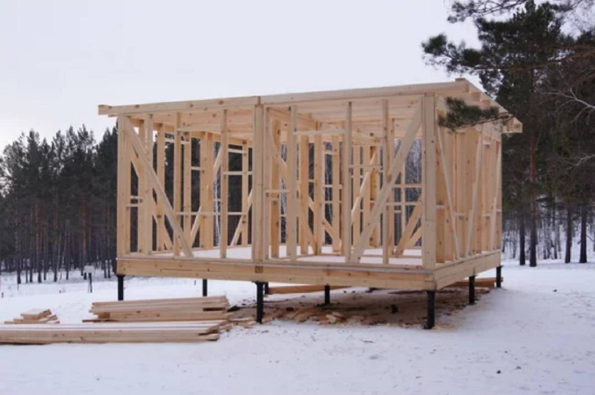 - традиционным — последовательно собирают каркас из стоек, ригелей, укосин, утепляют стены, монтируют обшивку;