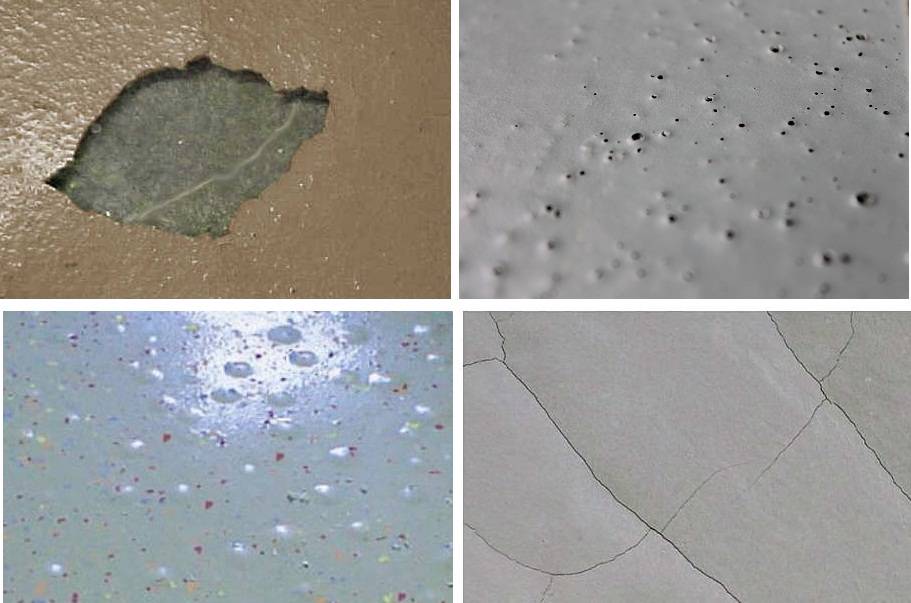Небрежности в подготовке основания. Пятна от жира, пыль, остатки краски, неиспользованных шпаклевок или цементно-песчаных растворов могут стать причиной отслоения смеси. Особенно часто не убирается с поверхности цементное молочко, появляющееся после заливки оснований жидким бетоном, а оно имеет очень низкие значения адгезии.