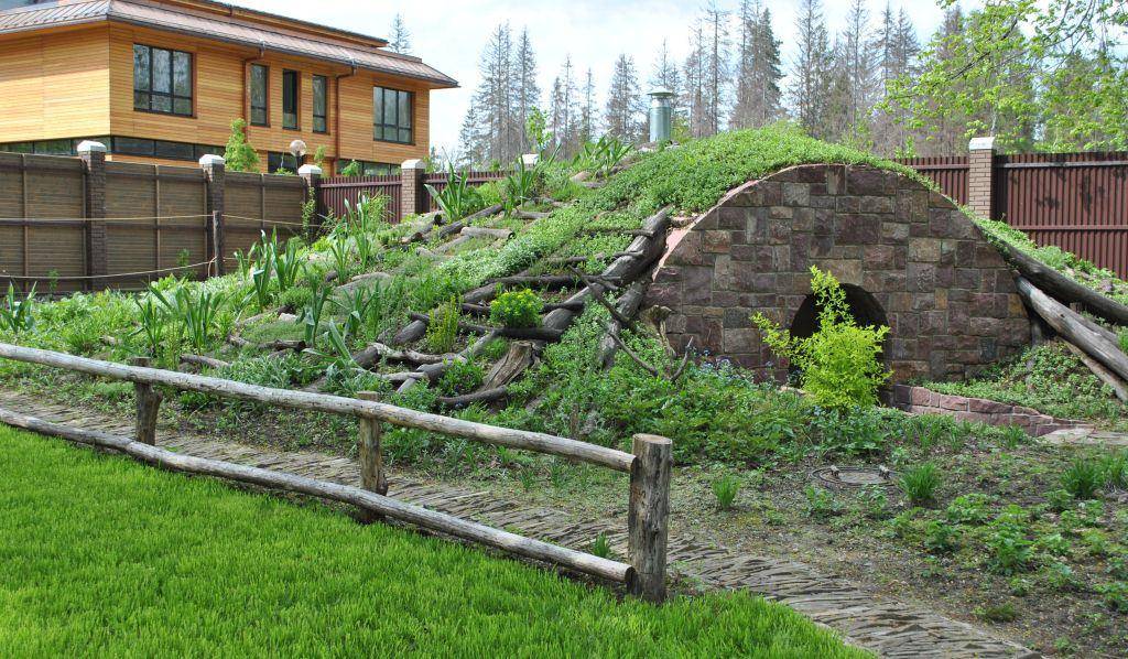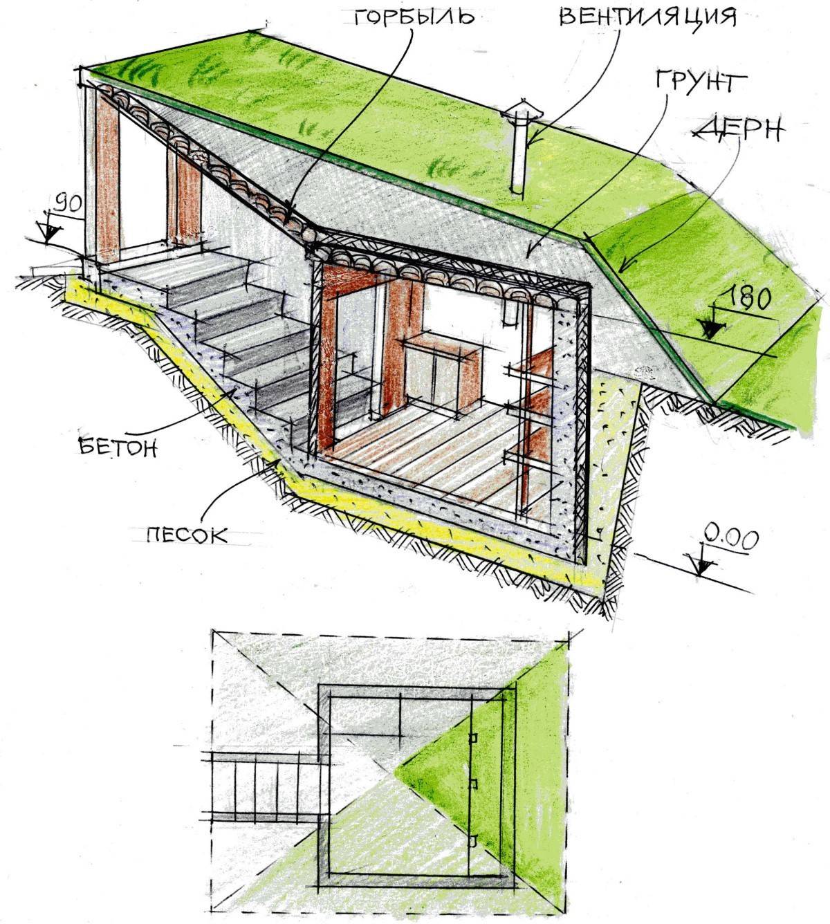 Отдельно стоящее сооружение обычно встраивают в естественный холм. Если приусадебный участок находится на равнине, погреб частично или полностью вкапывают в землю, искусственно создавая над ним холмик.